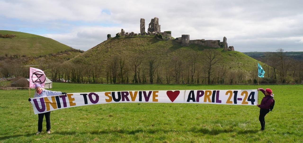 Extinction Rebellion campaigners hold a "Unite to Survive" banner at Durdle Door in Dorset, England on April 6, 2023.