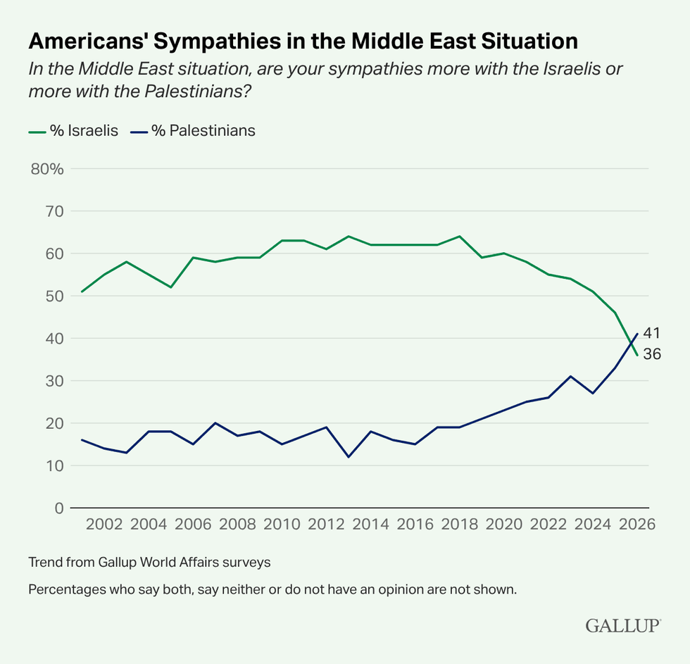 The new poll marks the first time since Gallup began tracking the question in 2001 that a larger portion of respondents (41%) expressed sympathy for the Palestinians than the Israelis (36%) "in the Middle East situation." The organization noted that while "the five-percentage-point difference is not statistically significant," it "contrasts with a clear lead for the Israelis only a year ago (46% vs. 33%) and larger leads over the prior 24 years."
