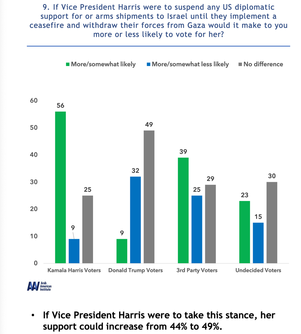A survey commissioned by the Arab American Institute found that endorsing an arms embargo would boost the Democratic nominee's support nationally from 44% to 49%.