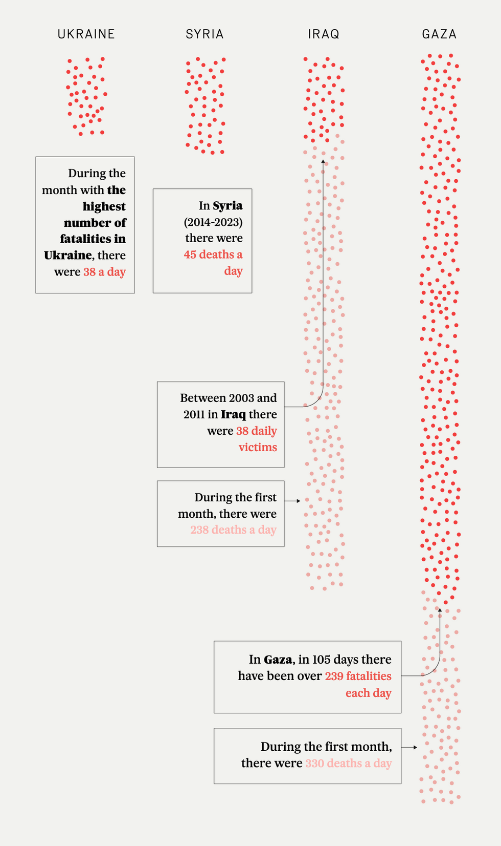 "It is difficult to find similar numbers in other recent conflicts," El País reported Monday. "The available data, compiled by the United Nations in the academic project Cost of War, indicate that more people are dying per day in Gaza than in Iraq (even in the worst month of fighting in that country), in Syria, or in the first month of war in Ukraine."