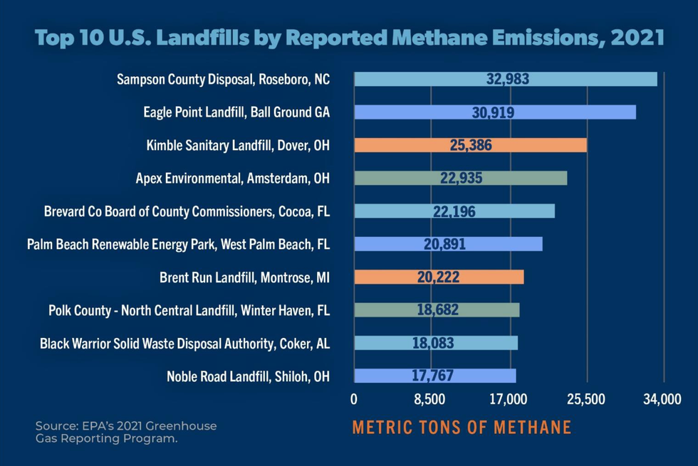 EIP ranked the 10 leading methane-emitting landfills in 2021, the most recent year for which data is available. Sampson County Landfill in Roseboro, North Carolina tops the list with 32,983 metric tons of methane released—more than 10 times the average landfill.