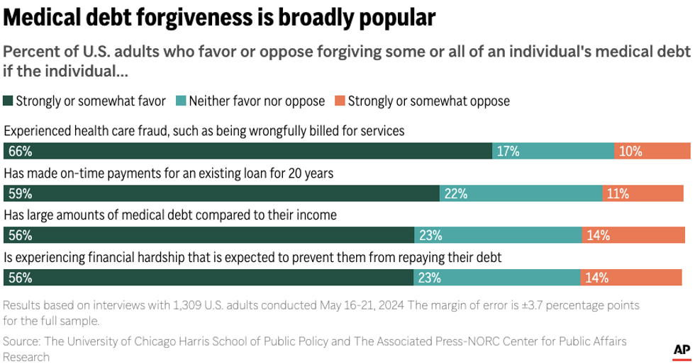 A majority of Americans support medical debt relief, with about half showing strong support, according to a new poll from the University of Chicago Harris School of Public Policy and The Associated Press-NORC Center for Public Affairs Research.