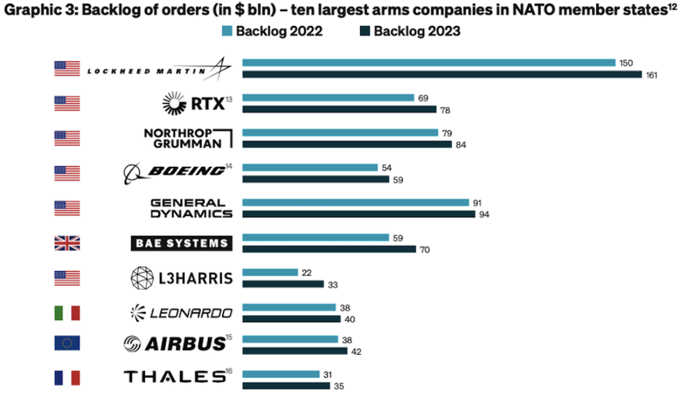 The "only winners" from NATO's spending policy are weapons manufacturers, says the briefing, which states that backlogs of weapons orders at the 10 largest arms companies based in NATO member countries went up by an average of 13% in 2023.