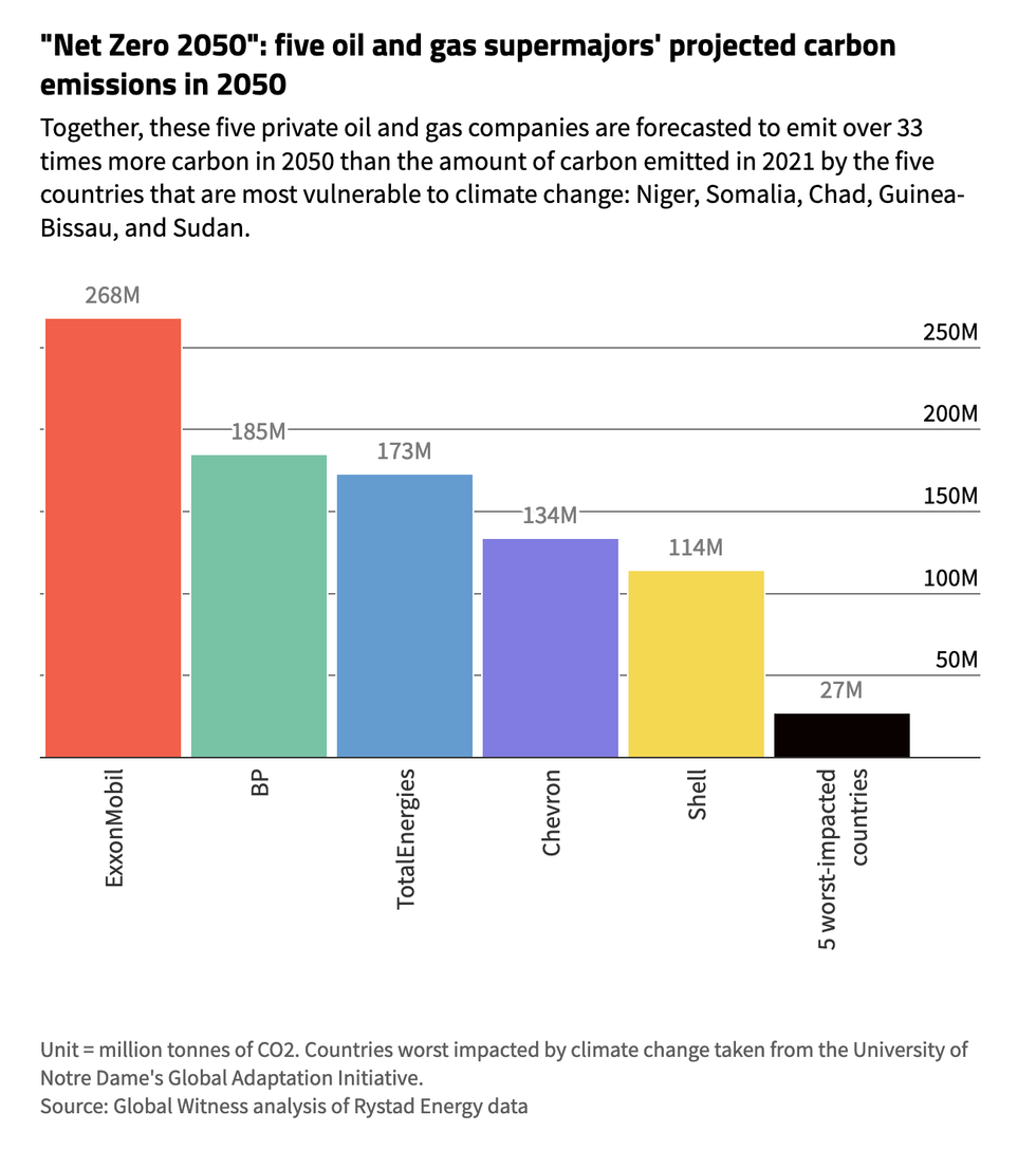 Citing data from the energy business intelligence agency Rystad, Global Witness noted that "in 2050 alone, these five major private western oil and gas companies are estimated to still produce oil and gas, which when burnt, equates to nearly 900 million tonnes of CO2."