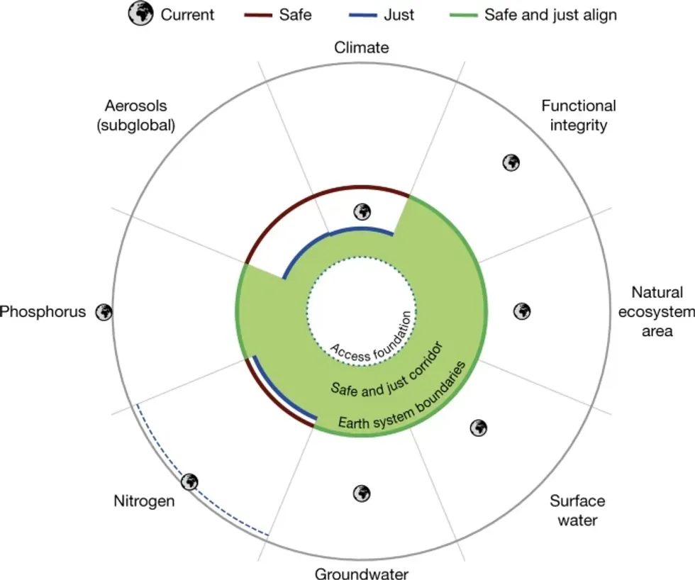 The paper includes the following image for reference. The Earth icons representing the current state of the planet should be in the green space, which marks where "safe" (red) and "just" (blue) ESBs overlap. Instead, they lie beyond the "safe and just corridor" for every indicator except aerosol loading.