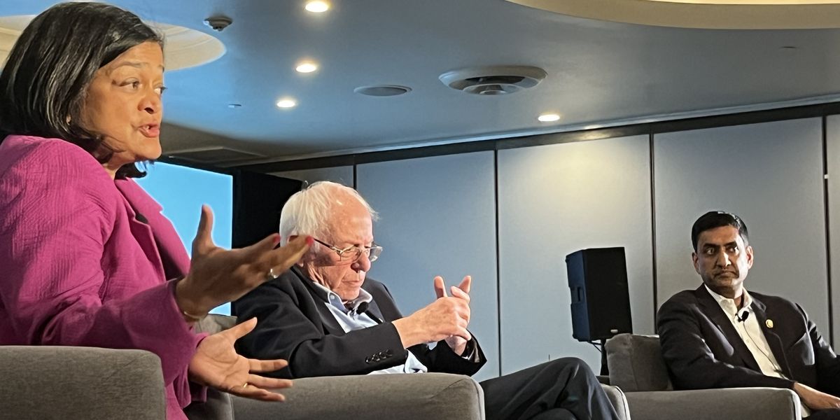 Rep. Pramila Jayapal (D-Wash.), Sen. Bernie Sanders (I-Vt.), and Rep. Ro Khanna (D-Calif.) speak during a panel discussion at the Sanders Institute Gathering that was held in Los Angeles, California on April 4, 2024.