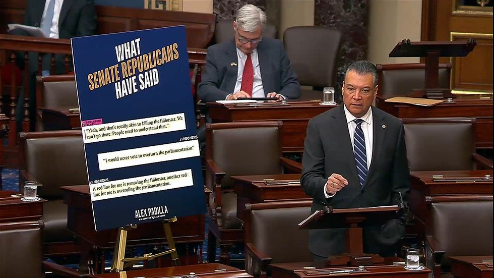 In a floor speech of his own, Sen. Alex Padilla (D-Calif.) directly quoted Senate Majority Leader John Thune's (R-S.D.) warning earlier this year against overruling the parliamentarian.
