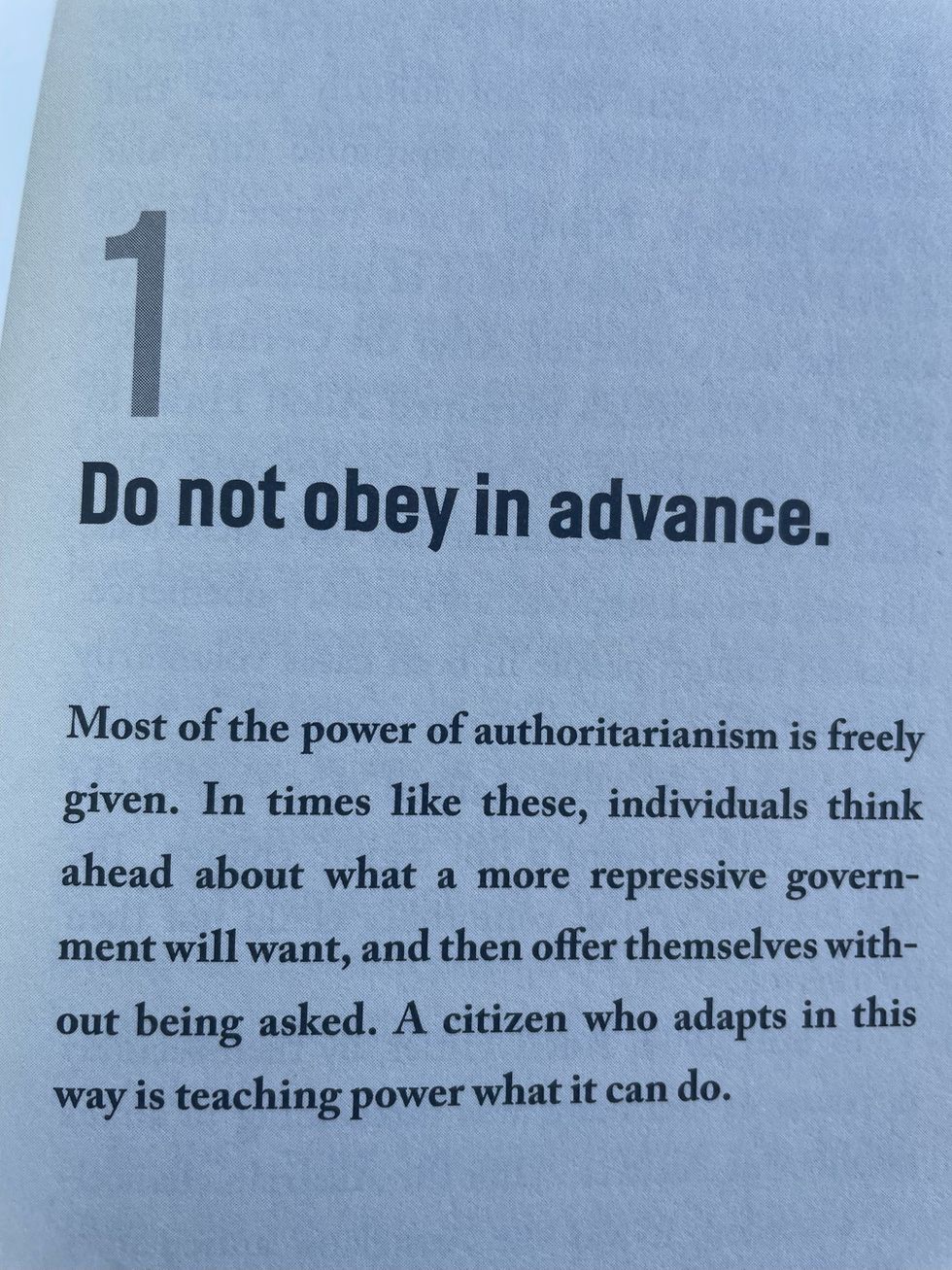 Others also cited Snyder. Abdelilah Skhir of the ACLU of Florida posted on social media a screenshot from his book On Tyranny: Twenty Lessons from the Twentieth Century: