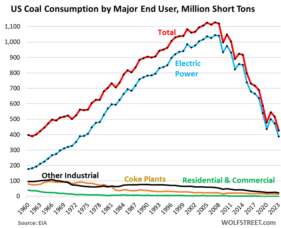 Climate and clean energy investor Ramez Naam wrote, "She is the past," and shared the graph below, which features data from the U.S. Energy Information Administration about coal consumption since 1960.