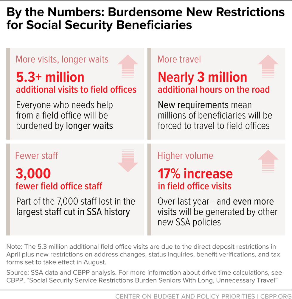 CBPP estimated that the restrictions on phone service will result in seniors spending an additional 3 million combined hours traveling to Social Security offices each year.