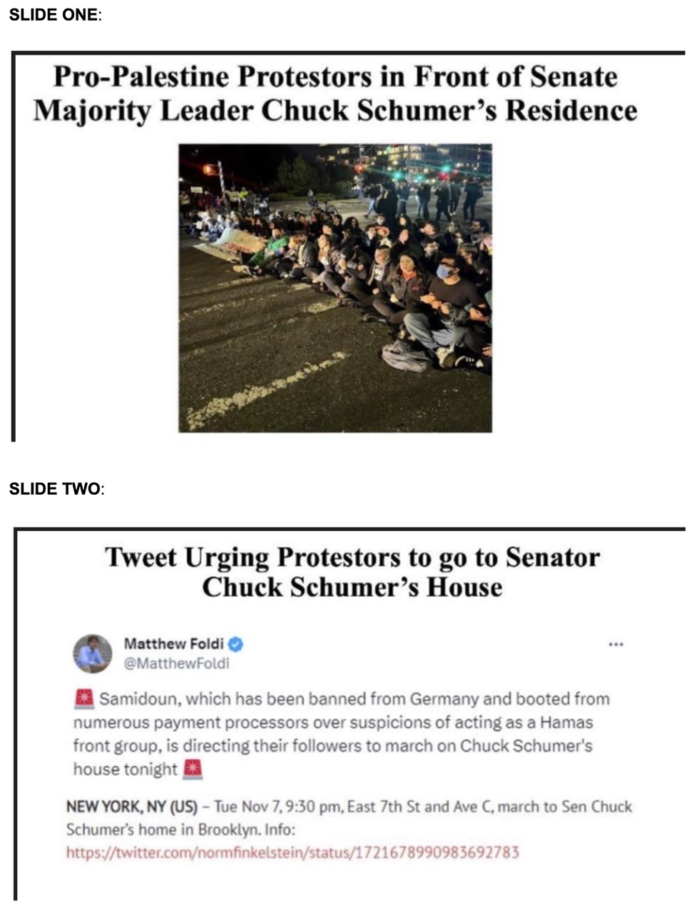 Turner—who opposes the bill with that and other reforms—reportedly displayed the slides about 15 minutes into the meeting, which latest over an hour. The first shows a photo of opponents of Israel's genocidal U.S.-backed war on the Gaza Strip protesting outside the Brooklyn residence of Senate Majority Leader Chuck Schumer (D-N.Y.). It does not note that the October 13 action was organized by Jewish Voice for Peace.