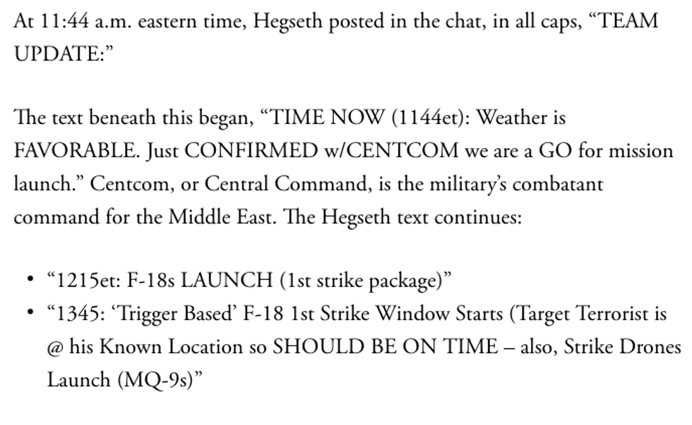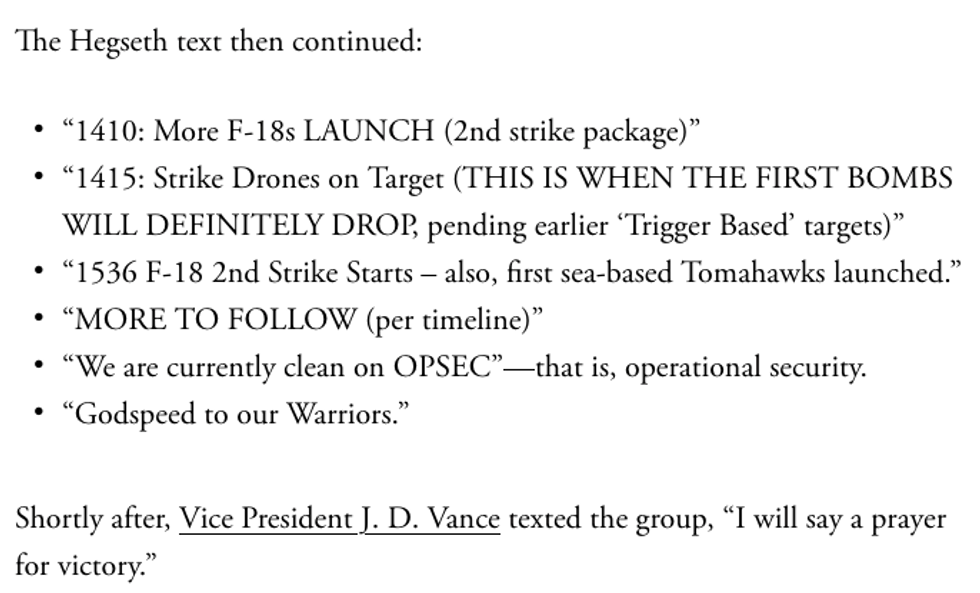 After this portion, Goldberg notes: "If this text had been received by someone hostile to American interests—or someone merely indiscreet, and with access to social media—the Houthis would have had time to prepare for what was meant to be a surprise attack on their strongholds. The consequences for American pilots could have been catastrophic."