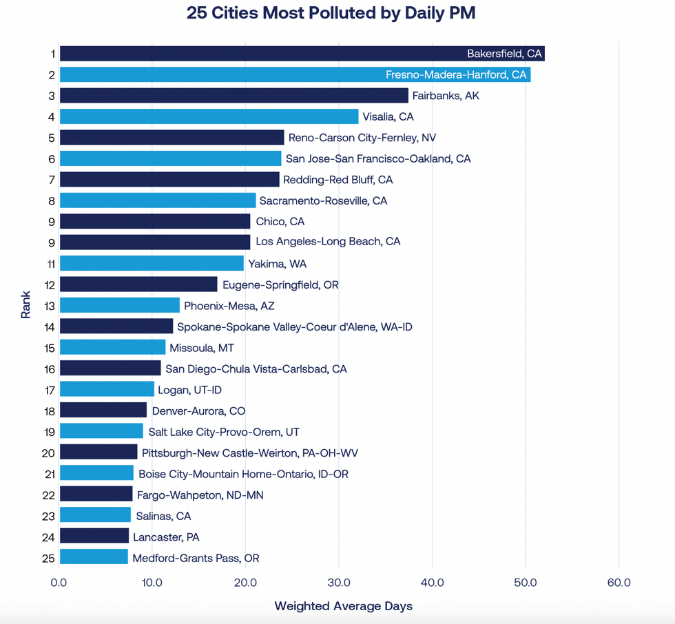 Eight of the 10 cities with the most days in which authorities warned of high particle pollution were in California, which experienced a relatively "mild" year for wildfires last year, but still counted nearly 7,500 wildfires including the destructive Mosquito Fire.