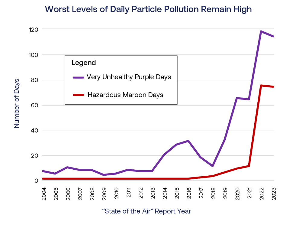 But the ALA's State of the Air report shows that the number of days when particle pollution levels are considered "very unhealthy" has skyrocketed in the last five years. Warnings were issued 10 times in 2016 compared to 113 in 2021.