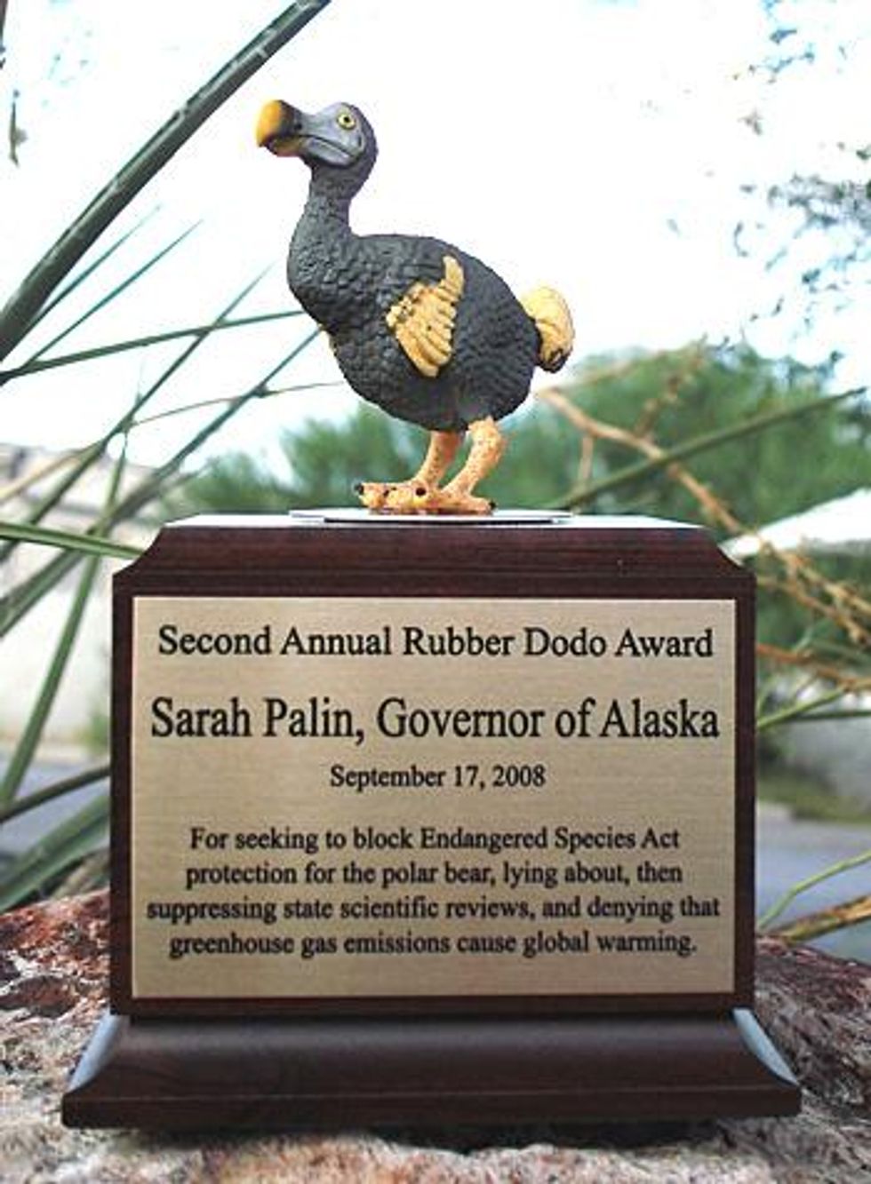 The Center for Biological Diversity today awarded Alaska Governor Sarah Palin the 2008 Rubber Dodo Award. Last year's award,