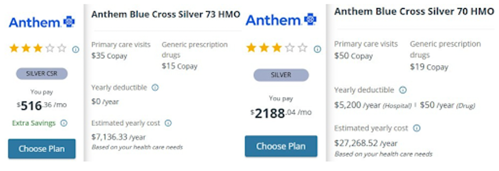 In Mission Viejo, California, premiums for the same couple's Anthem Blue Cross Silver plan would more than quadruple, from $516 per month this year to $2,188 next year.