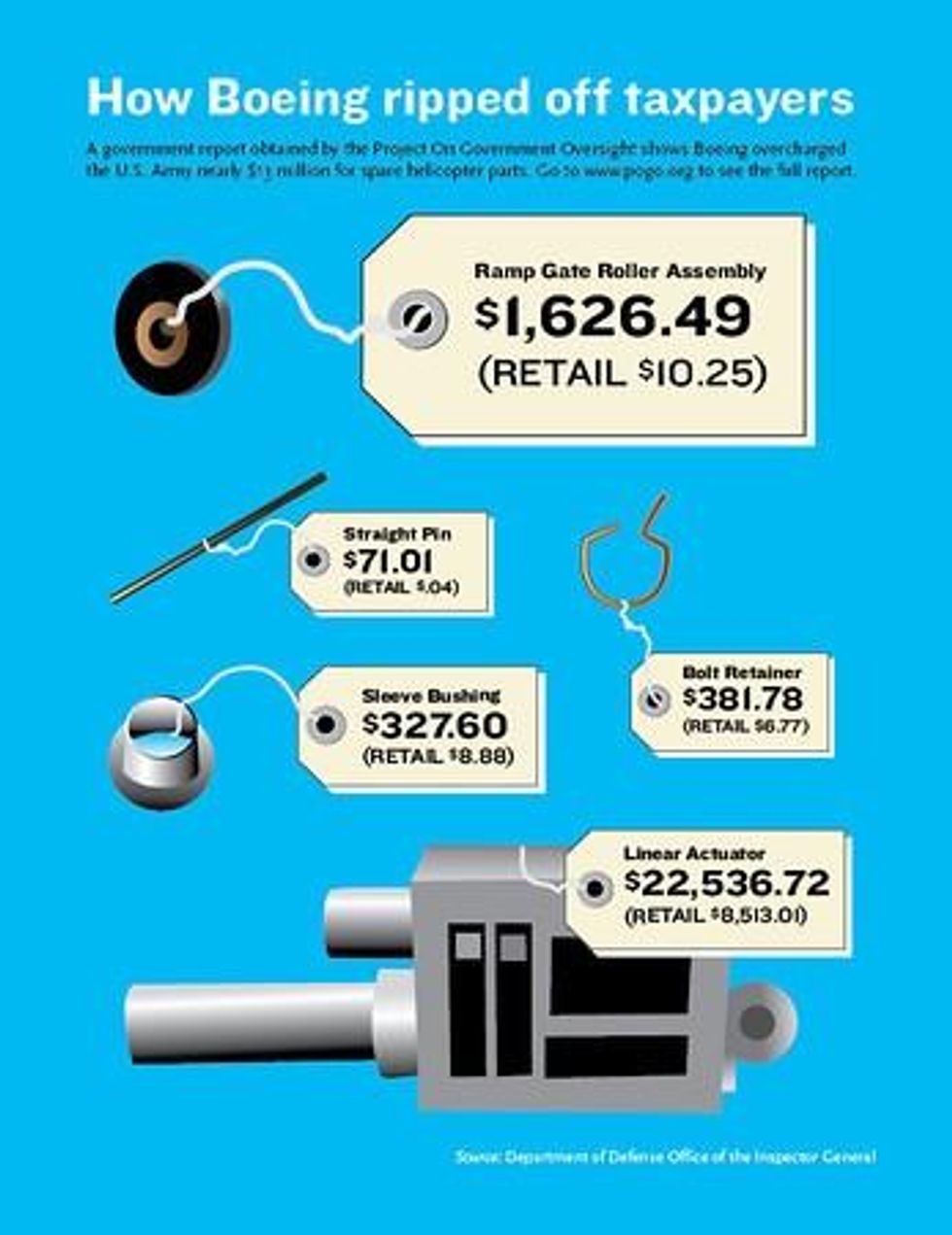 For more information, read: Leaked Audit: Boeing Overcharged Army Up to 177,000 Percent on Spare Helicopter Parts, June 28, 2011