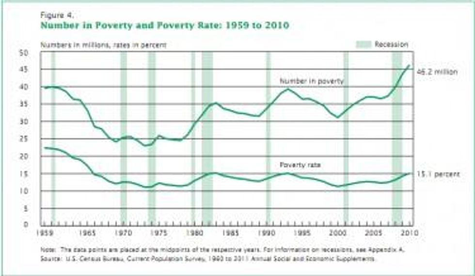Grayer is president of Legal Momentum, Casey is senior staff attorney with the group, which just released the memo "Reading Between the Lines: Women's Poverty in United States, 2010," which notes among many other findings: "The 40.7 percent poverty rate for solo mother families was 68 percent greater than the 24.2 percent rate for solo father families." The Census report states: "For related children under age six in families with a female householder, 58.2 percent were in poverty, about four times the rate of their counterparts in married-couple [households]."