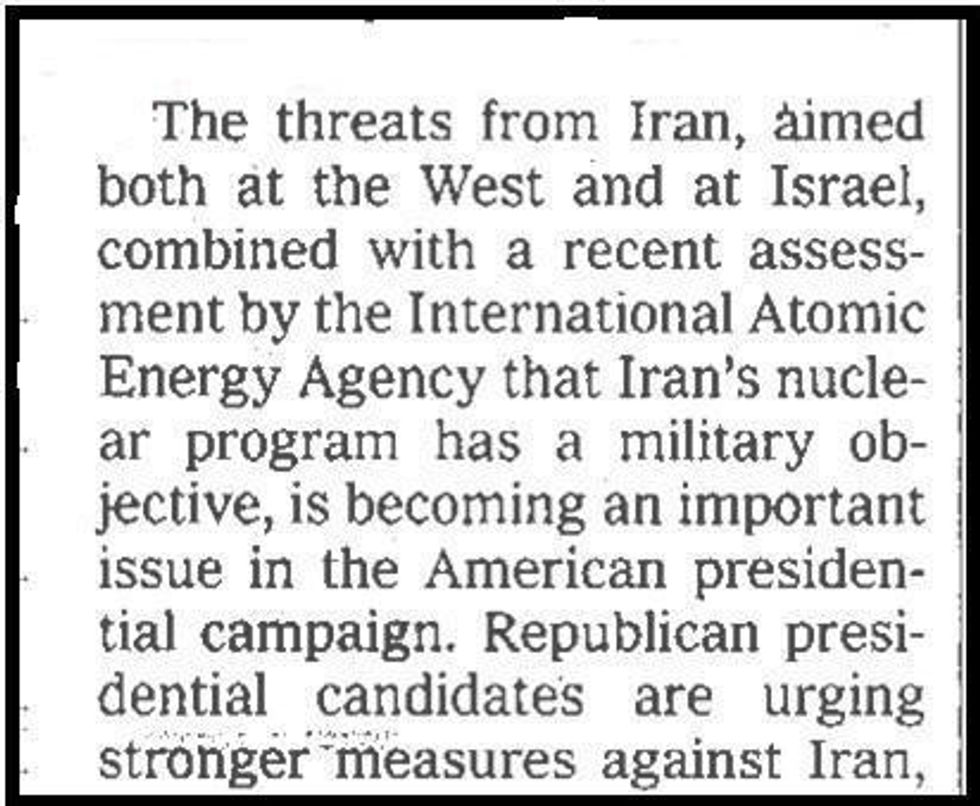 The threats from Iran, aimed both at the West and at Israel, combined with a recent assessment by the International Atomic Energy Agency that Iran's nuclear program has a military objective, is becoming an important issue in the American presidential campaign.