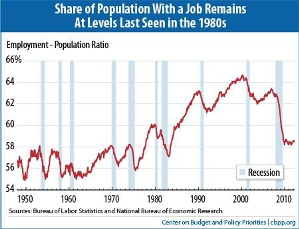 Today's jobs report disappointed expectations, with employers adding only 120,000 jobs in March, making clear that a strong jobs recovery remains elusive. The unemployment rate dipped to 8.2 percent, but that decline reflected people leaving the labor force, not finding jobs. The combination of high unemployment and depressed labor force participation leaves the share of Americans with a job at levels last seen in the mid-1980s (see chart). Though the economy could use a boost through monetary or fiscal policy, that's not likely to occur, further dampening hopes of strong job growth any time soon.
