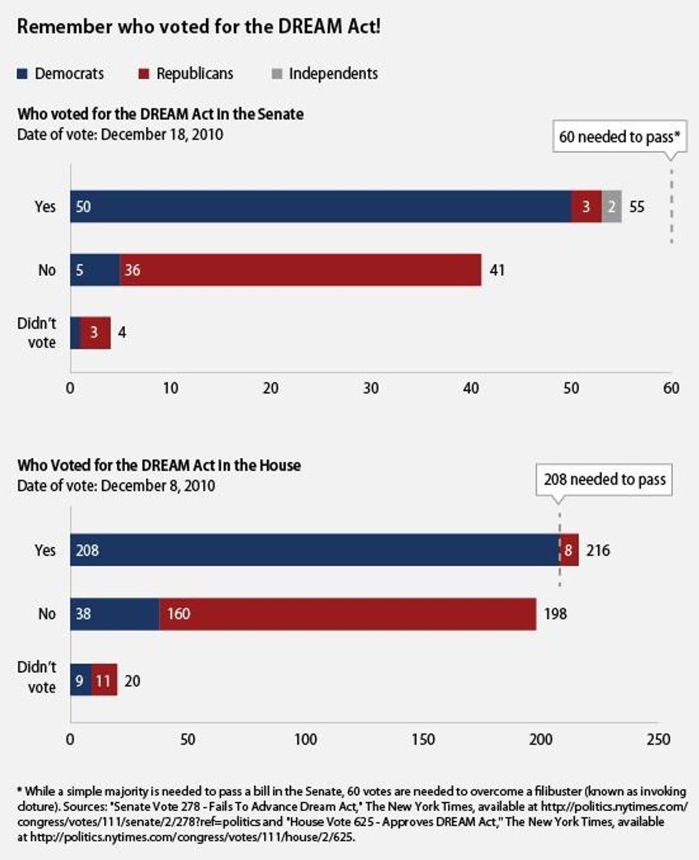Recent conservative commentators have argued, however, that President Obama should have passed the DREAM Act when his party controlled the House and Senate. But the infographic below shows those commentators are rewriting history: The bill was brought up for a vote in 2010 but conservatives filibustered it in the Senate.
