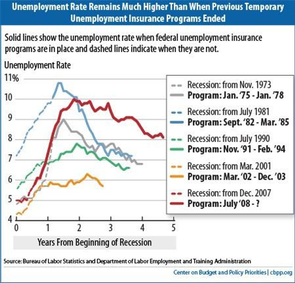Policymakers have enacted emergency federal UI in every major recession since 1958, and they have never allowed any of these previous programs to expire before unemployment fell to 7.2 percent or lower (see chart for the most recent five programs). As Federal Reserve Chairman Bernanke said on August 31 at Jackson Hole, WY, "Unless the economy begins to grow more quickly than it has recently, the unemployment rate is likely to remain far above levels consistent with maximum employment for some time."