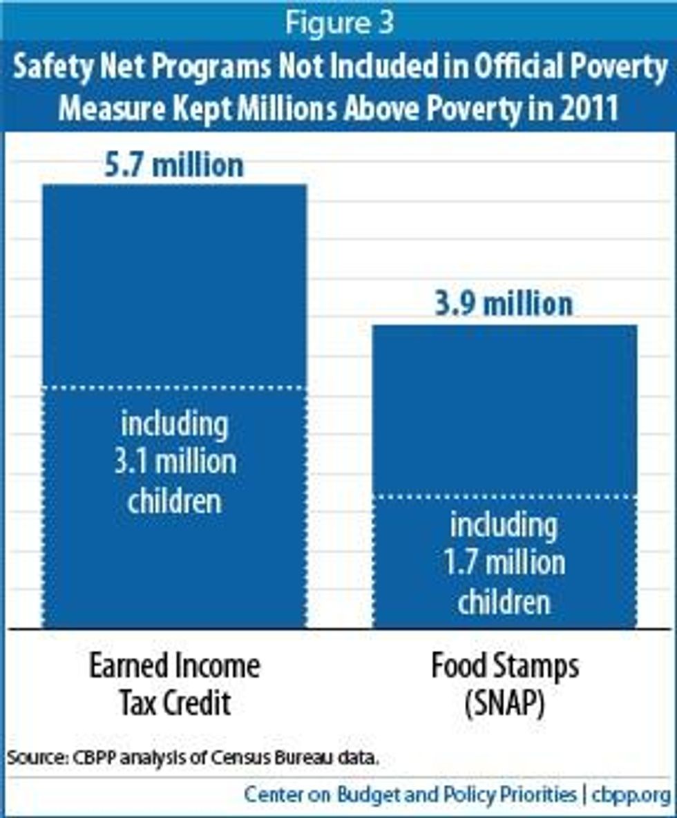 The Census data also show how many fewerpeople would be considered poor if two benefits that are not counted in the official poverty data -- the Earned Income Tax Credit (EITC) and SNAP (formerly known as the Food Stamp Program) -- are counted, as many analysts across the political spectrum believe they should be. Census officials said that if counted, the EITC would be seen to have lifted 5.7 million people -- including 3.1 million children -- out of poverty in 2011, and SNAP to have lifted out 3.9 million people, including 1.7 million children. (See Figure 3.)