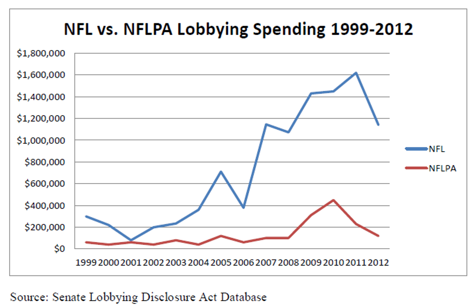 In 2012, the NFL spent $1.14 million on federal lobbying, a more than five-fold increase of what it spent a decade ago. The NFLPA, which spends far less on lobbying, saw its spending triple from $40,000 in 2002 to $120,000 in 2012.