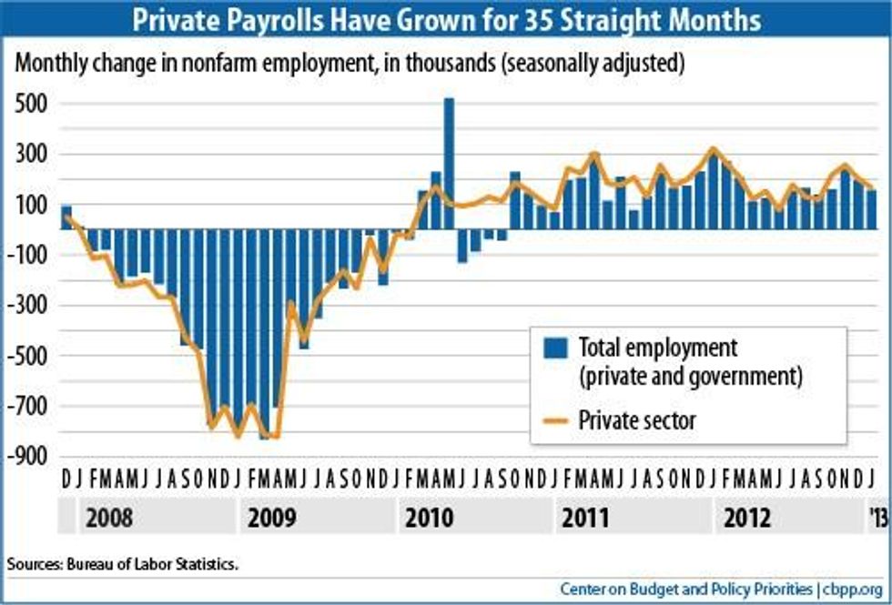 - Despite 35 months of private-sector job growth, there were still 3.2 million fewer jobs on nonfarm payrolls and 2.7 million fewer jobs on private payrolls in January than when the recession began in December 2007. Despite job growth averaging 200,000 jobs a month over the past three months, the addition of just 157,000 jobs in January is well short of the 200,000 to 300,000 jobs a month that would mark a robust jobs recovery.