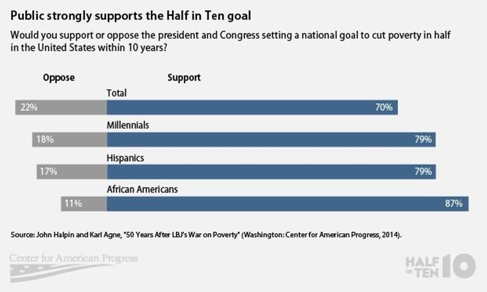 Fifty years after President Lyndon B. Johnson declared an "unconditional War on Poverty," a new poll released on a press call today by Half in Ten and the Center for American Progress finds that Americans strongly believe that poverty is primarily the result of a failed economy and strongly support the federal government setting a national goal to cut poverty in half over the next 10 years.