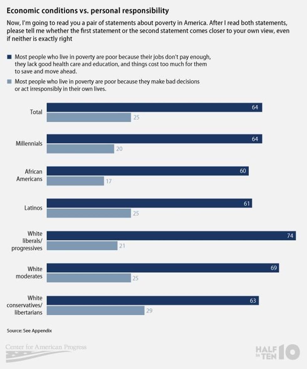 The poll found that nearly two in three Americans--64 percent--agree that most people who live in poverty are poor because their jobs do not pay enough, they lack quality health insurance and education, and things cost too much for them to save and get ahead, underscoring the current economy's failings in the areas of wages, health care, education, and cost of living. This outlook prevailed across demographic and ideological lines, further dispelling the narrative that poverty is the result of personal decisions and lack of effort.