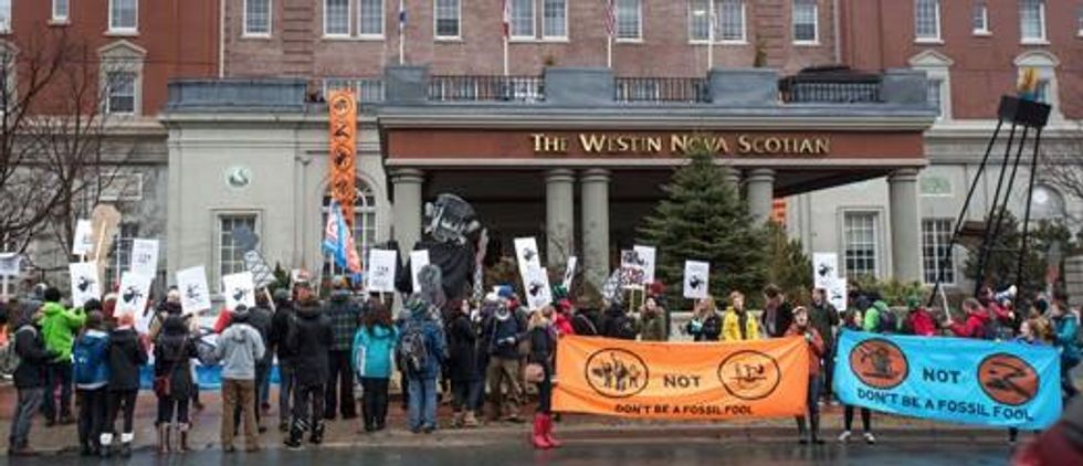 The disruption, which shut down the breakfast briefing, was supported by students, youth and environmental justice organizers from across Canada. "Projects like the tar sands and the Energy East pipeline are driving climate change and devastating communities," said Robin Tress, an organizer with PowerShift Atlantic a youth climate justice summit that brought hundreds of young people to Halifax over the weekend. "We're taking action today to show that we're ready to stand with Indigenous communities on the frontlines of the struggle against affronts to their sovereignty and destruction of the environment."