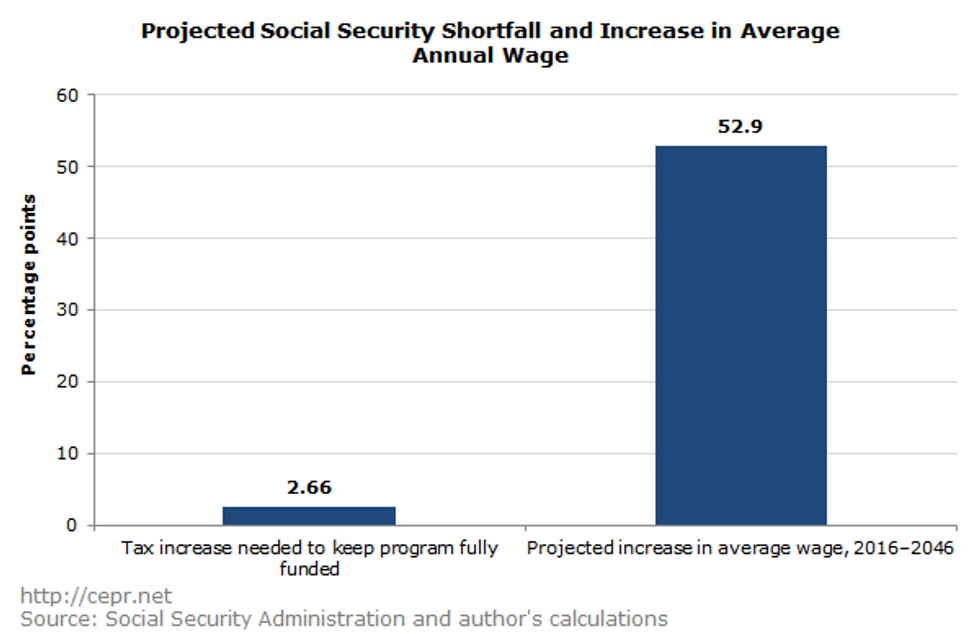 "As can be seen, the projected increase in the average real wage of 52.9 percent is almost twenty times as large as the 2.66 percentage point increase in the payroll tax. This means that workers have vastly more at stake in whether they will receive their share of wage growth over this period, than whether it is necessary to raise the Social Security tax rate at some point. The former will depend on factors like trade policy, patent and copyright policy, and the Federal Reserve Board's decisions on interest rates. (Of course any shortfall in Social Security could be covered through other mechanisms than increases in the payroll tax.)