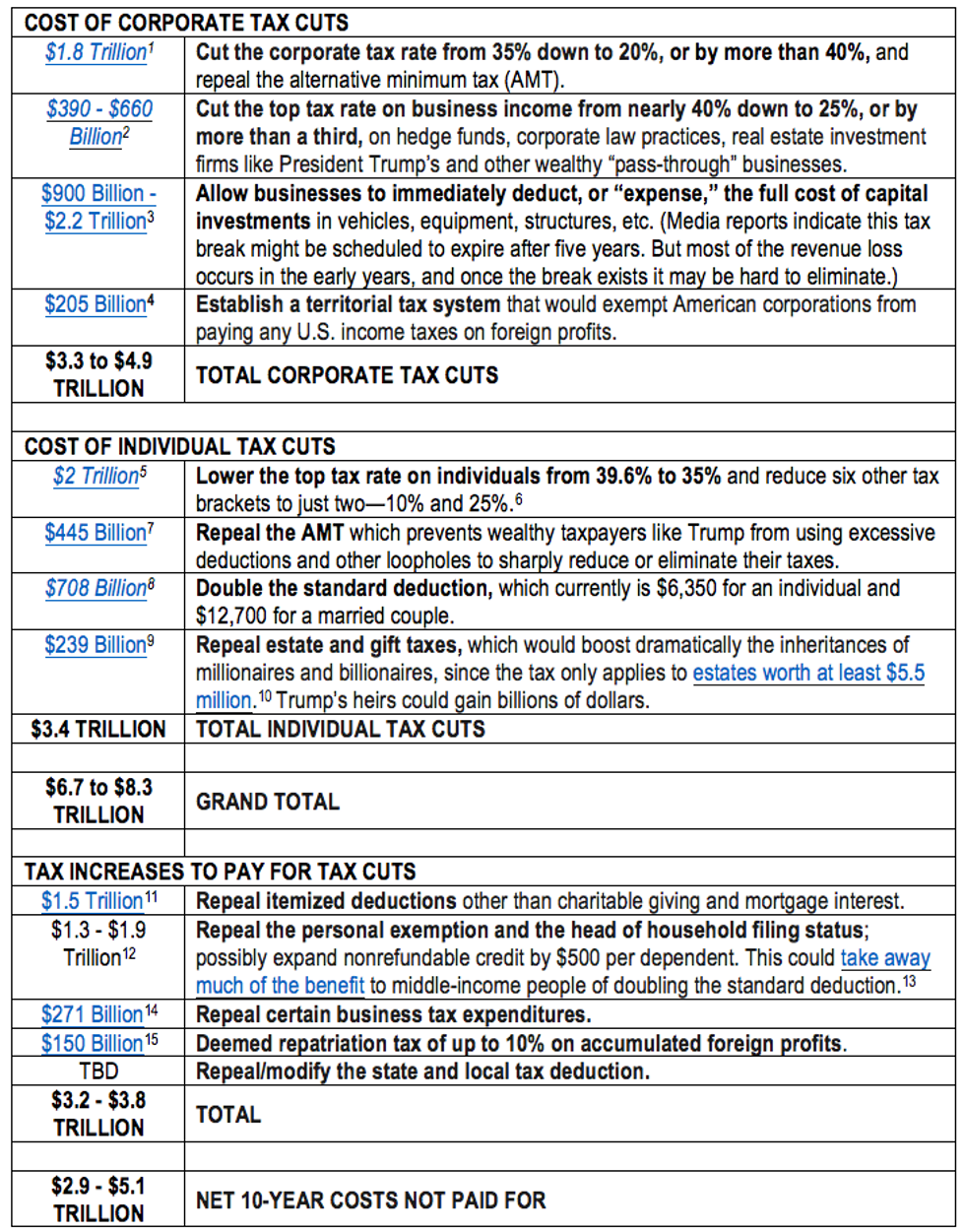 As President Trump and Republican leaders in Congress prepare to unveil their tax plan on Wednesday, Sept. 27, Americans for Tax Fairness has prepared an analysis that shows Trump's tax cuts could total $6.7 to $8.3 trillion, $3 to $5 trillion of which may not be paid for by closing other tax loopholes and/or by limiting tax deductions. The resulting jump in the deficit threatens funding of Social Security, Medicare, Medicaid, public education and other vital services. This analysis is based on recent media reports identifying possible tax cuts under consideration by the "Big Six" of Trump Administration and Congressional negotiators, and on the tax-cutting priorities President Trump and House Republican leaders have emphasized in tax plans unveiled over the past year.