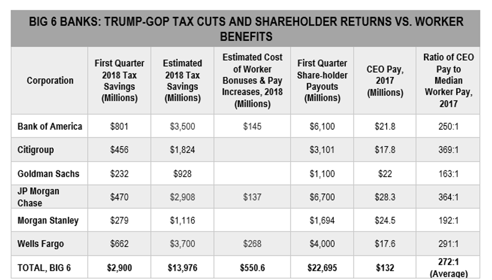 The nation's Big 6 Wall Street banks--Bank of America, Citigroup, Goldman Sachs, JP Morgan Chase, Morgan Stanley, and Wells Fargo--are among the biggest winners from the Trump-GOP tax cuts, collectively saving an estimated $14 billion in 2018 alone. [See table below] That's 25 times more than three of the six banks have promised to give their workers in pay raises and one-time bonuses purportedly related to the tax cuts. The other three big banks have not publicly announced that they will share any of their tax cuts with their employees.