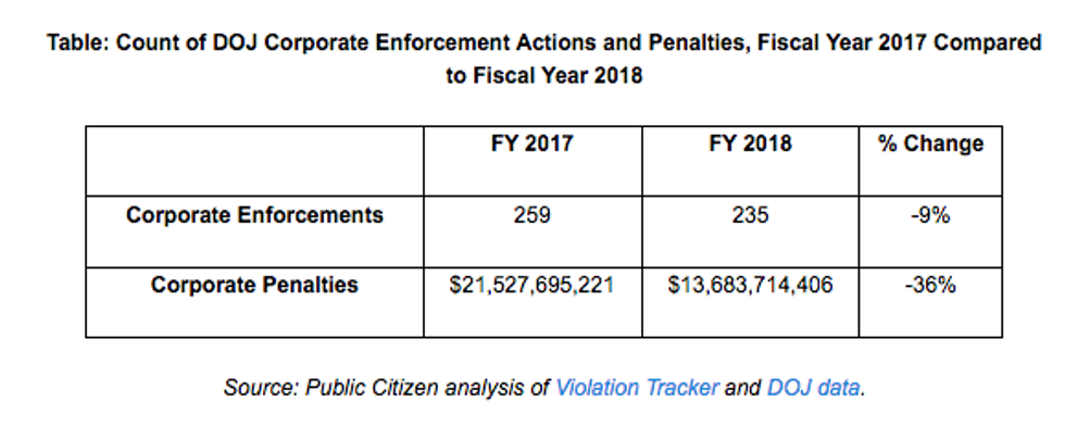 Public Citizen's July 2018 Corporate Impunity report documented plummeting corporate enforcement in Sessions' DOJ and throughout the Trump administration.