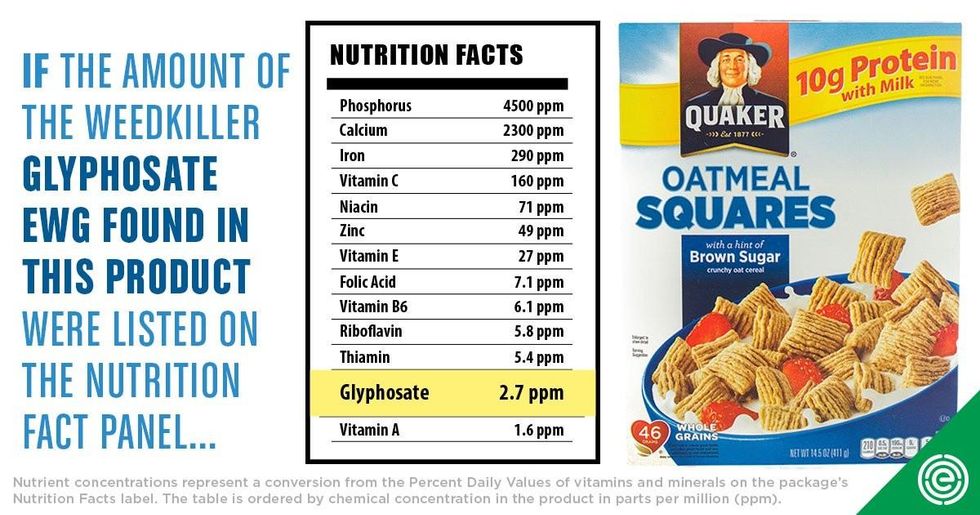 Laboratory tests commissioned by EWG found levels of glyphosate, first produced by Monsanto as Roundup, in samples of General Mills' Honey Nut Cheerios. The amount of the toxic pesticide exceeded the amount of both Vitamin D and Vitamin B12. In a sample of Quaker Oatmeal Squares, there was more glyphosate than Vitamin A.