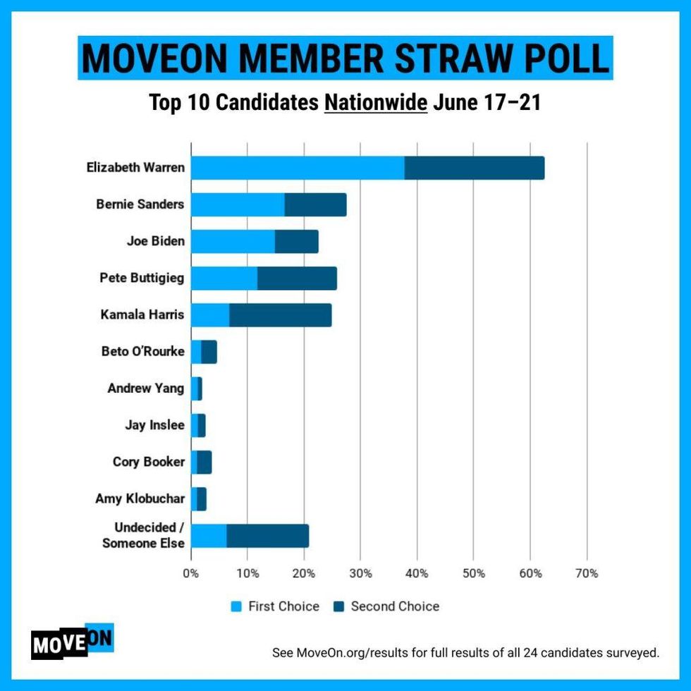 Sanders is the first or second choice of 28% of MoveOn members in the latest straw poll, with South Bend Mayor Pete Buttigieg (26%), Sen. Kamala Harris (25%), and former Vice President Joe Biden (23%) also ranking in the top five candidates among MoveOn members' first and second choices nationwide. The straw poll was conducted from June 17-21.