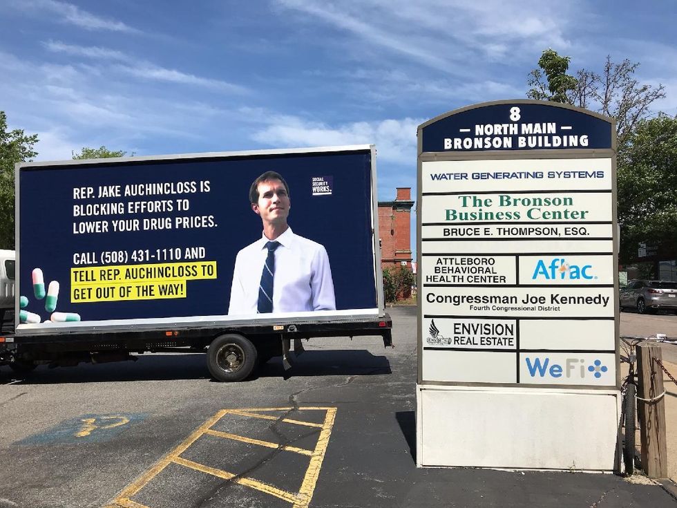 A truck displaying the billboard is parked outside Auchincloss's Attleboro District Office. (Auchincloss has not yet replaced former Rep. Joe Kennedy's name on the sign outside.)