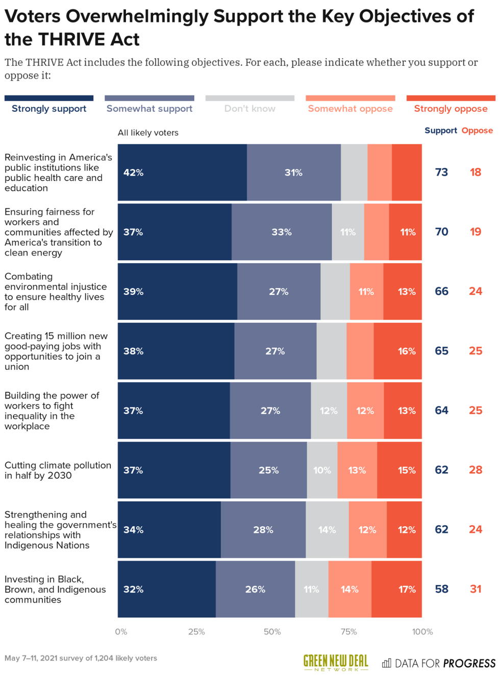 - Voters overwhelmingly back all of the THRIVE Act's main policy objectives, with every objective earning broad bipartisan support, including reinvesting in healthcare and education institutions, ensuring a just transition to clean energy, combating environmental injustice, creating 15 million new jobs, and cutting climate pollution in half by 2030