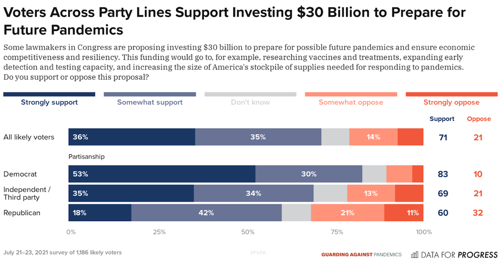 "The current pandemic illustrates the importance of this vital funding to prepare us for future pandemics. Not only will this funding protect American lives and our economy, it's something that voters widely support, according to Data for Progress polling," said Marcela Mulholland, Political Director at Data for Progress. "This isn't just common sense -- this is a policy that is overwhelmingly popular with voters. It's time for Congress to listen."