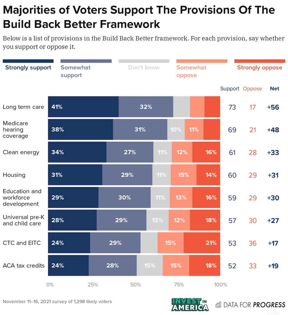 A substantial majority of voters support the Build Back Better Act in its current form and strongly support its provisions, a new poll released today by Data For Progress and Invest in America finds. 64% of voters, including 87% of Democrats, 63% of Independents, and 42% of Republicans, support the Build Back Better Act. Additionally, Data for Progress finds a majority of voters support BBB's pay-fors and provisions: