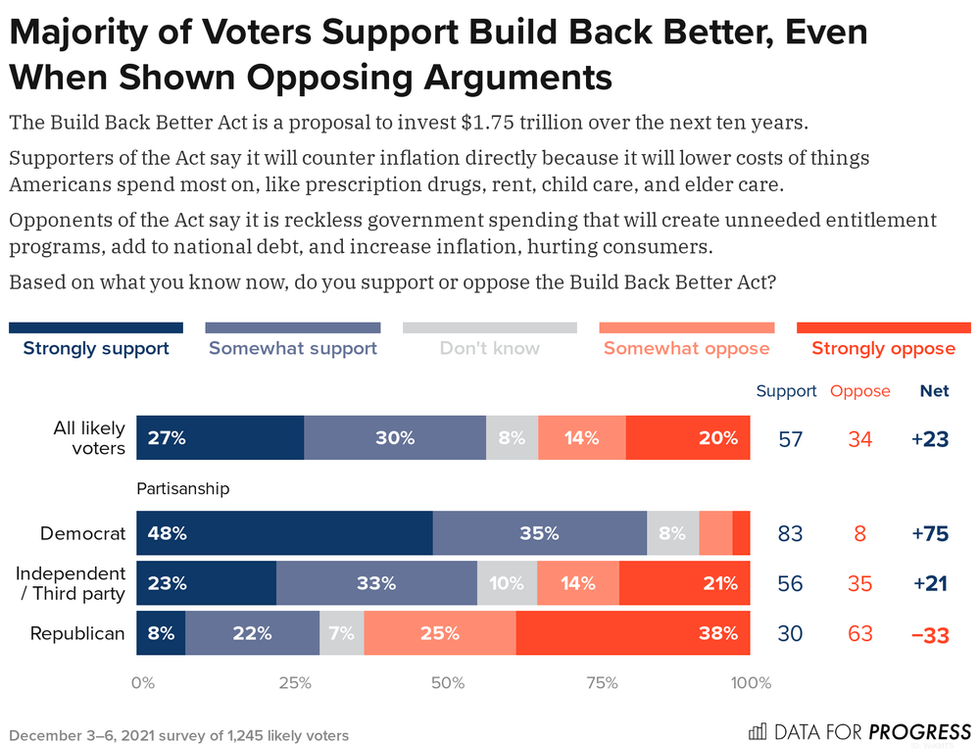 Today, Data for Progress released a new poll finding strong and continued majority support for the Build Back Better Act, even after voters are shown common opposing arguments for the plan. Data for Progress finds a majority of voters support the Build Back Better Act after being shown such arguments by a +23-point margin. This support includes Democrats by +75 points, Independents by +21 points, and nearly a third of Republicans.