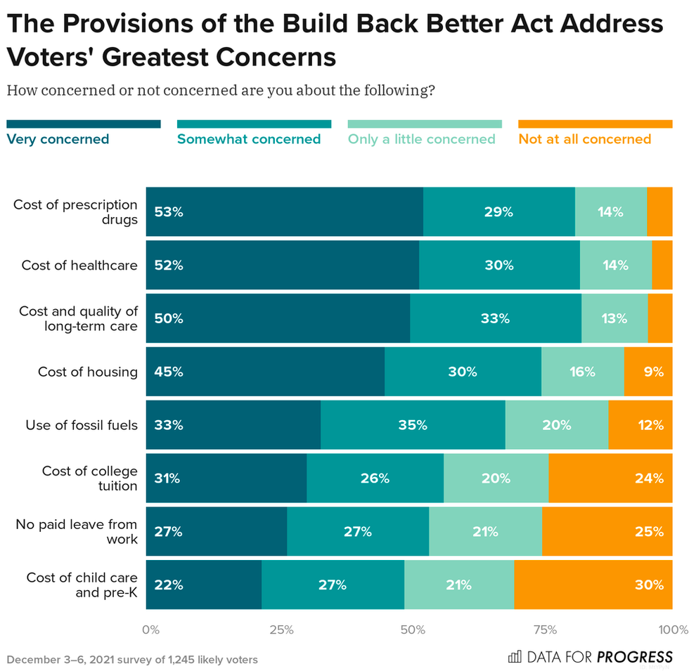 "Our polling finds that voters continue to strongly support the Build Back Better Act, even after being shown the most common arguments opposing the plan," said Ahmad Ali, Press Secretary of Data for Progress. "We also find voters are most concerned about household costs like prescription drugs and long-term care that provisions of the Build Back Better Act would reduce."