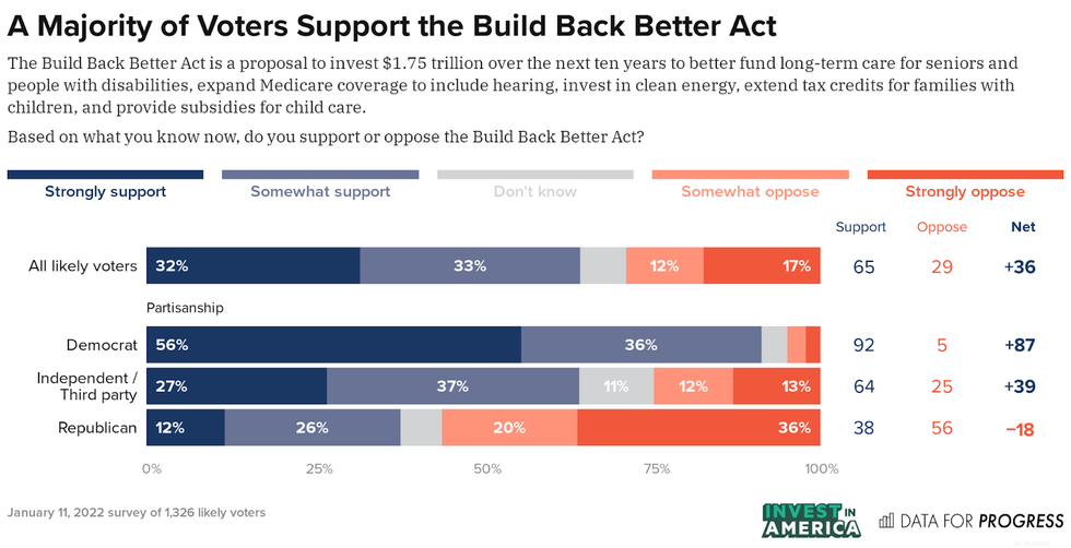 65% of voters, including 92% of Democrats, 64% of Independents, and 38% of Republicans, support the Build Back Better Act.