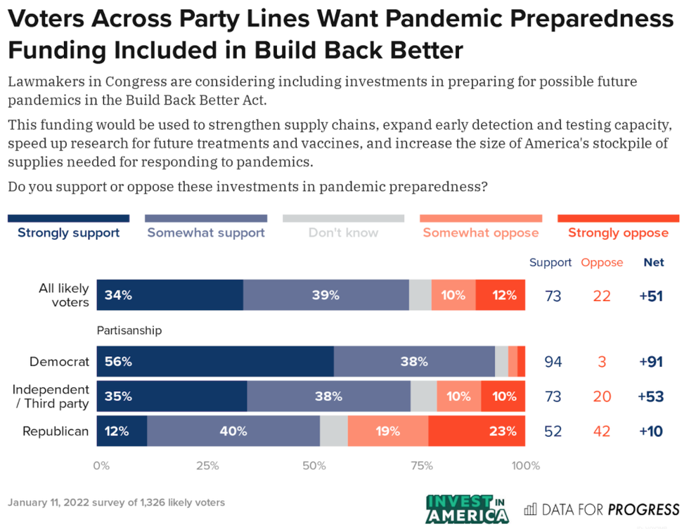 55% of voters, including 80% of Democrats and 54% of Independents, believe funding for pandemic preparedness is a good reason to pass the Build Back Better Act.