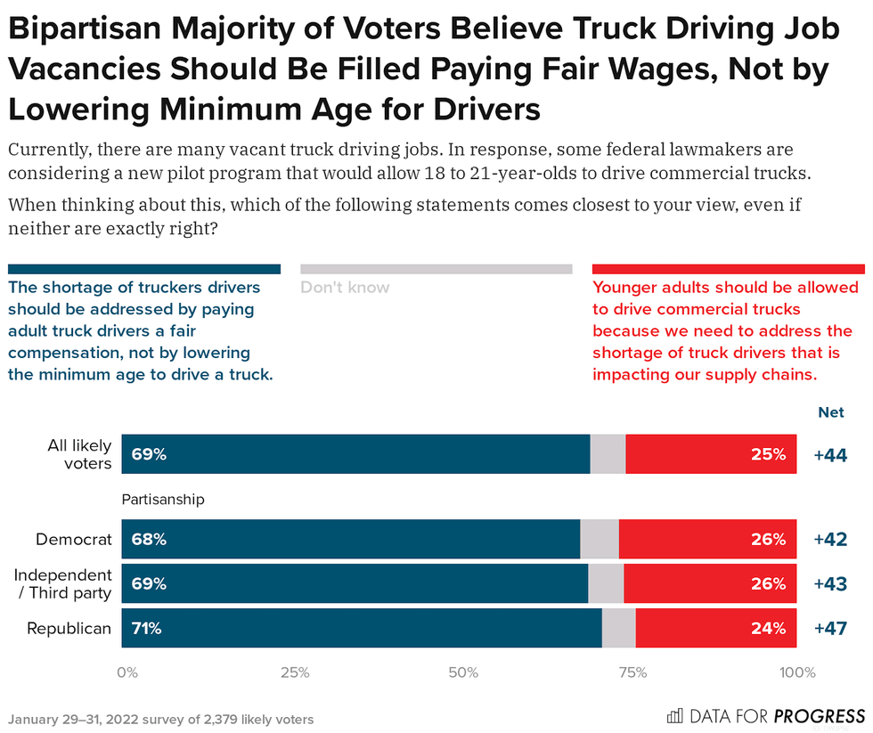 Support for addressing trucking job vacancies through offering higher wages, not lowering the age limit for driving commercial trucks, by a +44 point margin, which includes independents and Republicans by margins of +43 and +47 points, respectively.