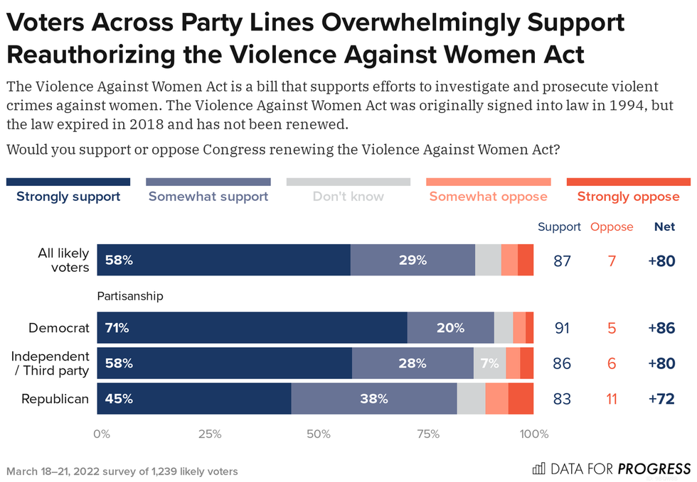 "Voters overwhelmingly support reauthorizing the Violence Against Women Act," says Data for Progress Deputy Press Secretary Devi Ruia. "President Biden signing this important, bipartisan reauthorization into law is a necessary step towards protecting women that will save lives and aid marginalized communities."