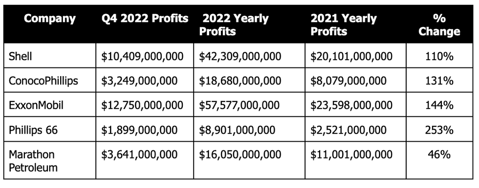 As two of the countries’ largest oil companies enjoyed historically high-profit margins last year, their fourth-quarter earnings call revealed that they had spent $41 billion in 2022 on stock buybacks and dividends, further enriching their wealthy shareholders.