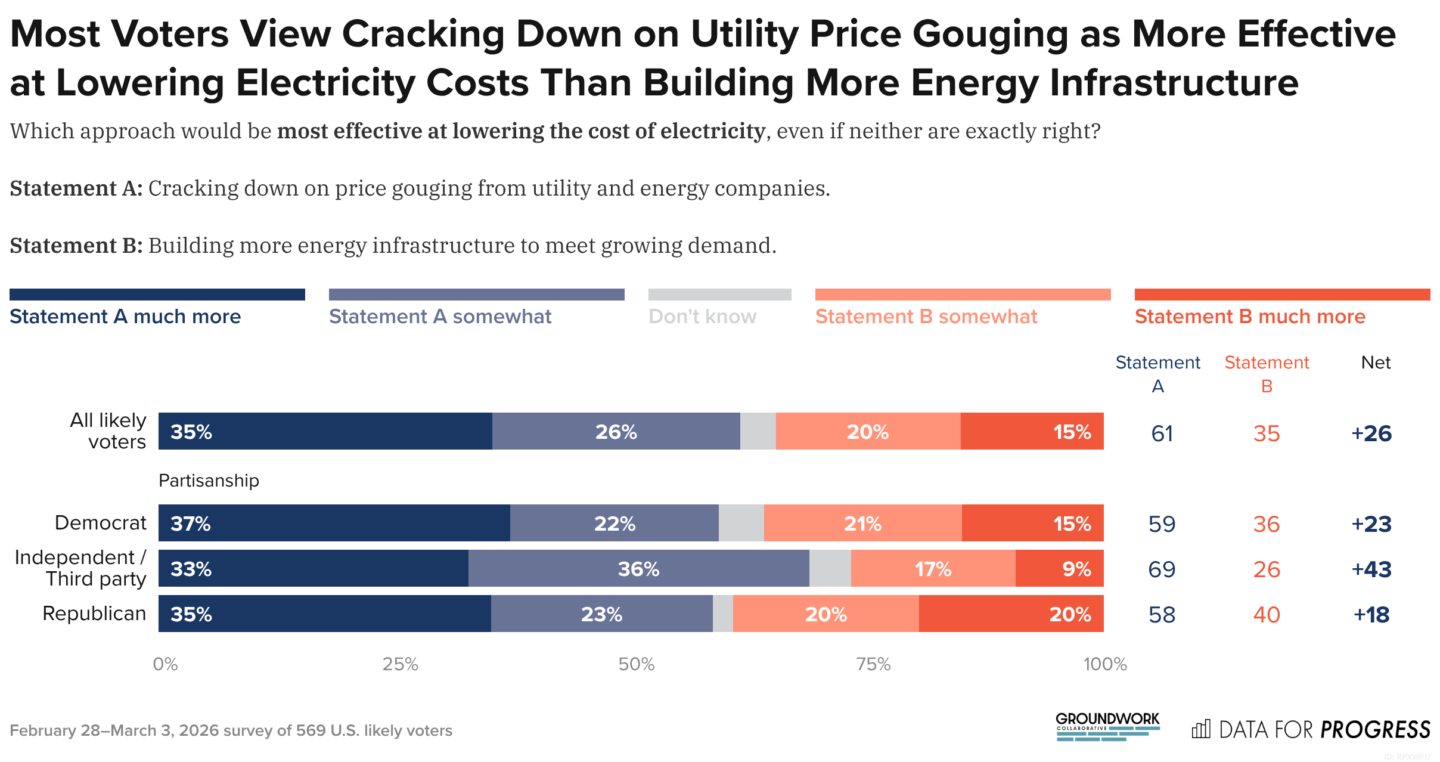 As President Trump’s escalating war with Iran pushes energy prices higher, Americans are looking for ways to keep electricity bills in check. New polling from Groundwork Collaborative and Data for Progress reveals Americans reject the Trump Administration’s plan to rely on voluntary commitments from corporate actors to lower household bills.